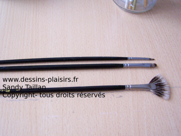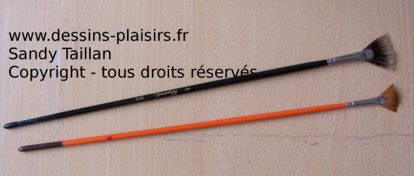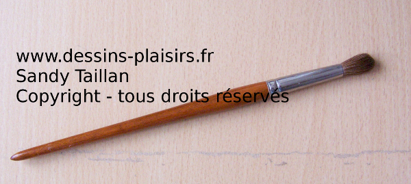 Je ne l’utilise que pour un seul pinceau : il s’agit d’un pinceau rond assez épais que j’utilise à sec. Il suffit de le ‘promener’ très délicatement sur la surface de la peinture avec des mouvements circulaires ou de haut en bas pour obtenir un très bon fondu. C’est idéal pour ne pas laisser de trace de pinceau. J’ai découvert l’utilisation de ce pinceau grâce au cours de peinture en ligne Drawing-Tutorials-Online.com.