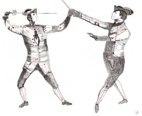 Dessin réalisé fin novembre 2008. Après chaque cours, nous devons réaliser un dessin à partir de quelques données du professeur. Là, il s’agissait de dessiner deux duellistes en pleine action en recopiant un dessin. C’est un exercice très agréable à faire. Il faut seulement recopier, c’est un fait, mais en réfléchissant sur les articulations et en les plaçant correctement.