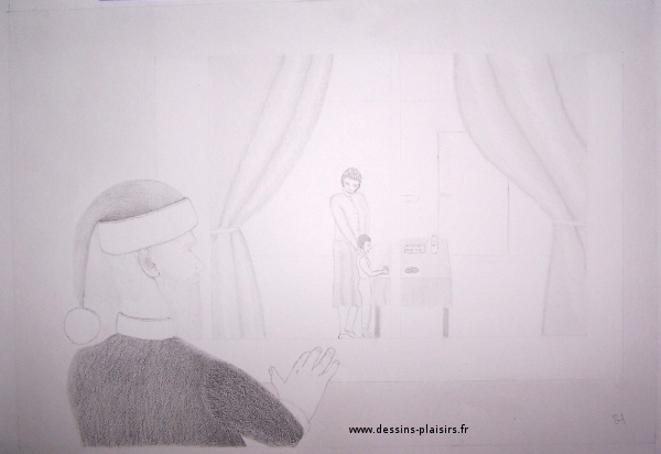 Ce dessin représente un père Noël regardant par une fenêtre. Dans la maison, on peut voir un enfant et sa mère préparer un verre de lait et des petits gâteaux pour le père Noël.